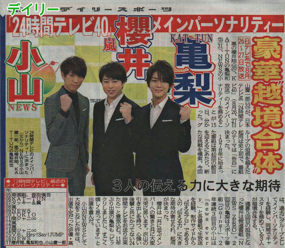 嵐の櫻井翔、KAT-TUNの亀梨和也、NEWSの小山慶一郎が、日本テレビ系「24時間テレビ40」のメインパーソナリティーを務める
