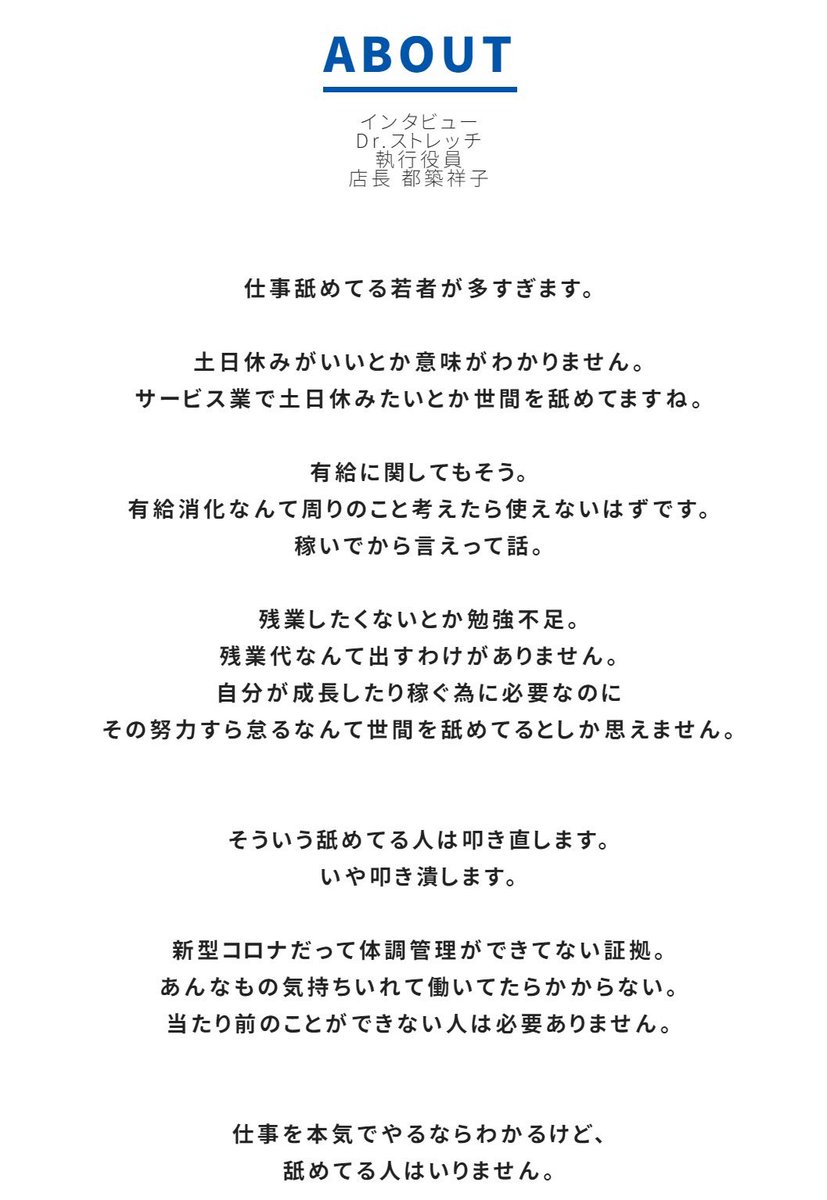 Dr.ストレッチ、社長や店長は「のっとりです」って言ってるけど、とりあえず「残業」の件は労働基準監督署が調べた方が良いんじゃないかなぁ。前に勤めてたっぽい人たちのツイートによると残業NGだったって言うし。それが本当ならきちんと正さないとね。