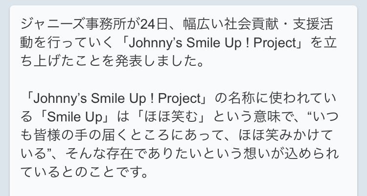 7月24日に立ち上げた社会貢献・支援活動を行っていく「Johnny’s Smile Up ! Project」で活動している