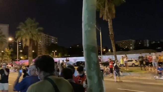 Muchos aficionados delante de las oficinas gritando "Bartomeu, dimissió"