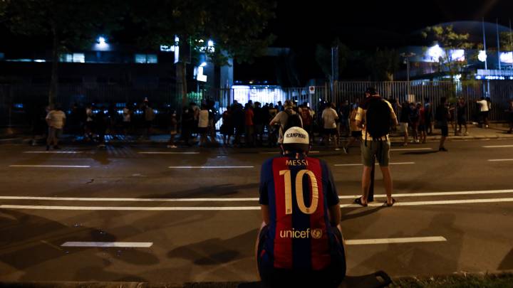 Aficionados del Barcelona reunidos para pedir la permanencia de LIONEL MESSI en las inmediaciones del Camp Nou pic.twitter.com/xEjWFpifsR